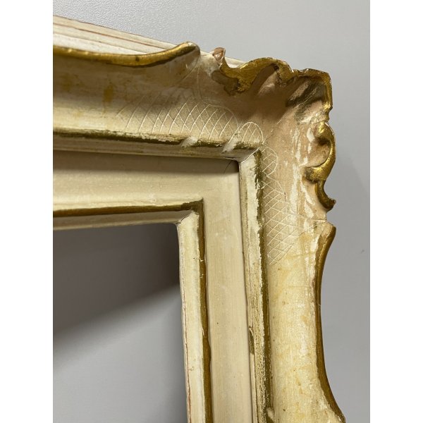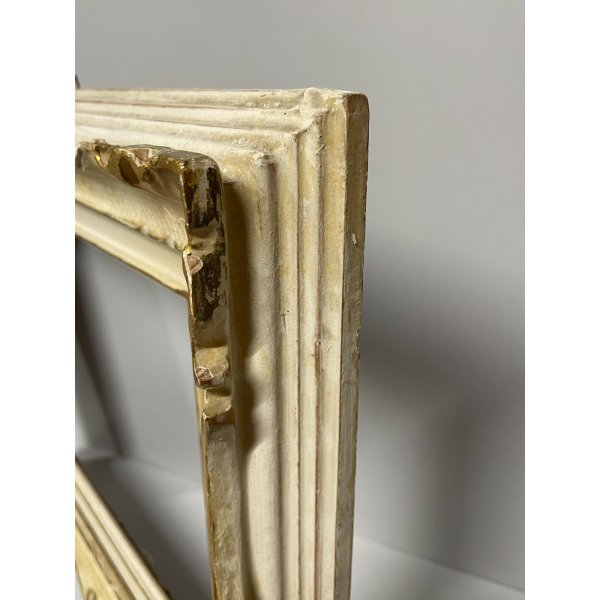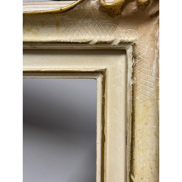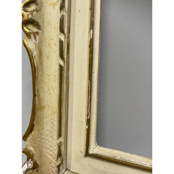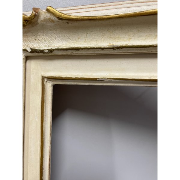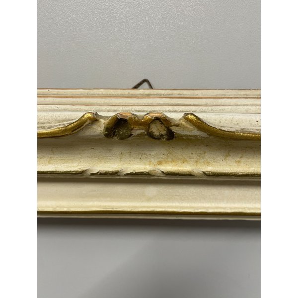 Fantastica antica piccola cornice bianca con dettagli dorati, scolpita a mano, orizzontale o verticale, a piacere spostare il gancio, per quadri stampe o specchi.