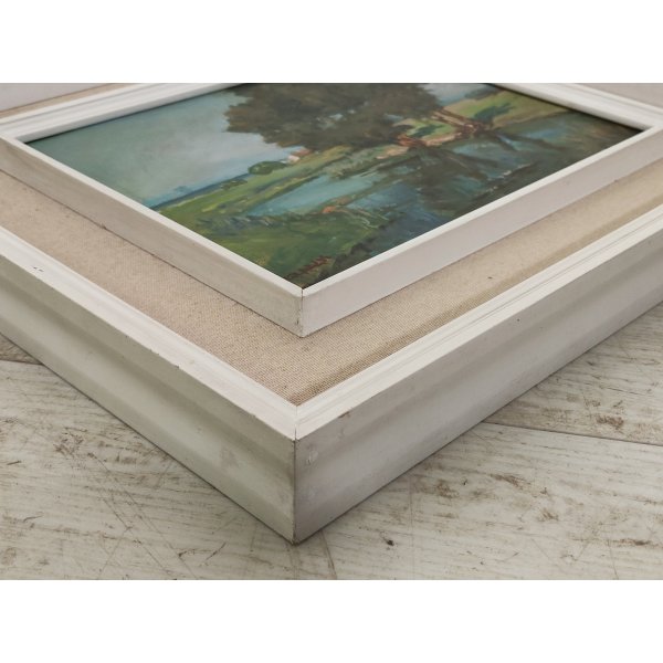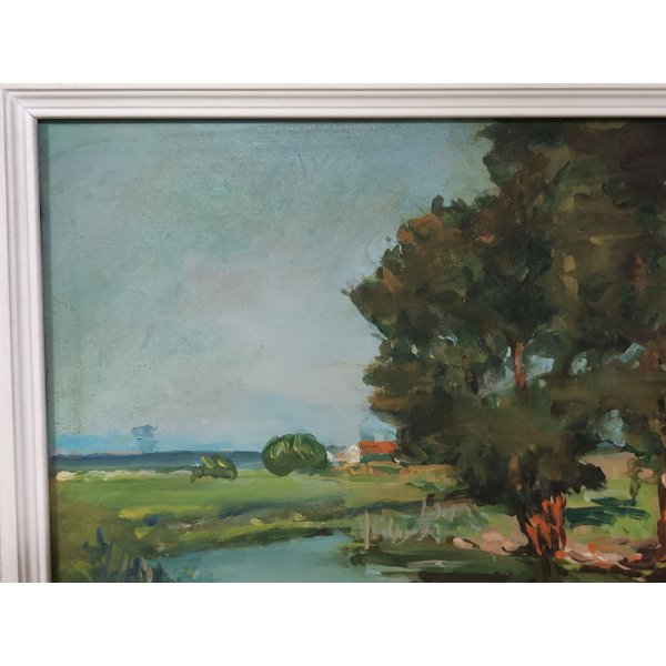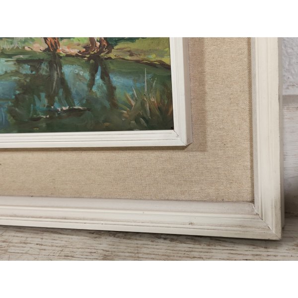 Delizioso quadro, dipinto ad olio su tavola, raffigurante un paesaggio di campagna con laghetto ed alberi, opera di "
