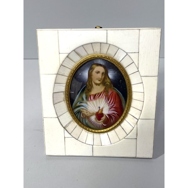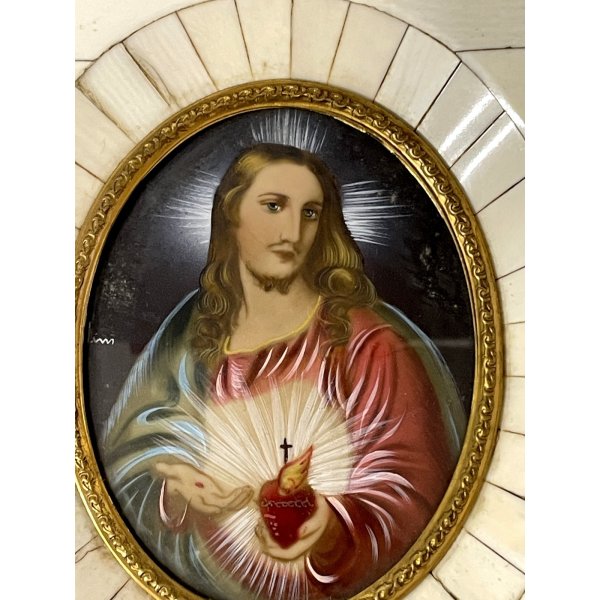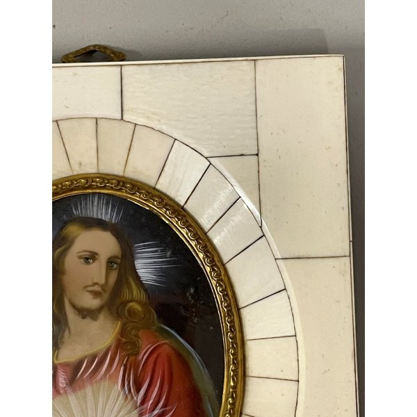 Stupendo ritratto, miniatura, rappresentante Gesu' Cristo con in mano un sacro cuore, dipinta a mano su bachelite con forma ovale contornata da un profilo decorato in filigrana di ottone dalla stupenda lavorazione.contenuta in una bellissima cornice di materiale pregiato, sul retro rivestimento in stoffa bordeaux.