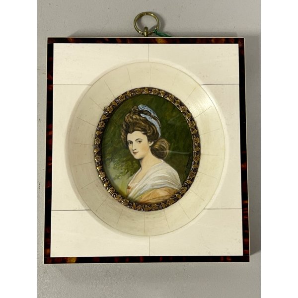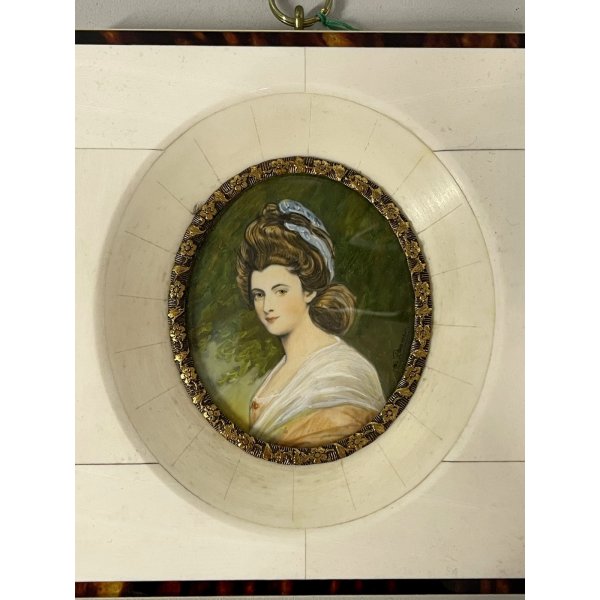 Stupendo ritratto, miniatura, rappresentante una nobile donna dipinta a mano su bachelite con forma ovale contornata da un profilo decorato in filigrana di ottone dalla stupenda lavorazione e contenuta in una bellissima cornice di materiale pregiato.