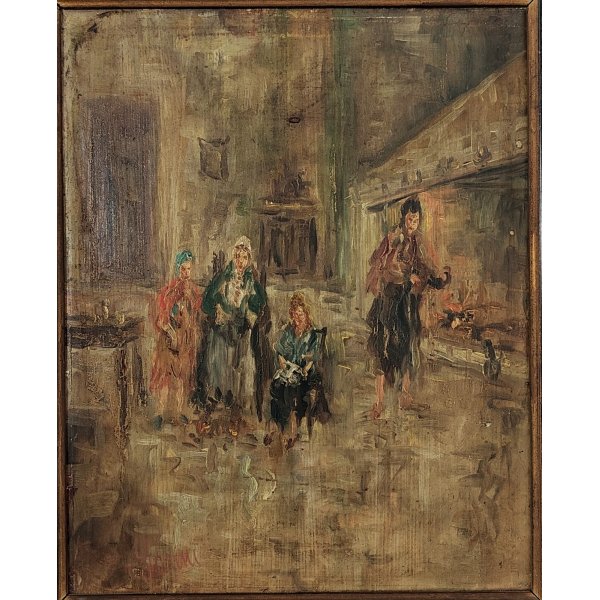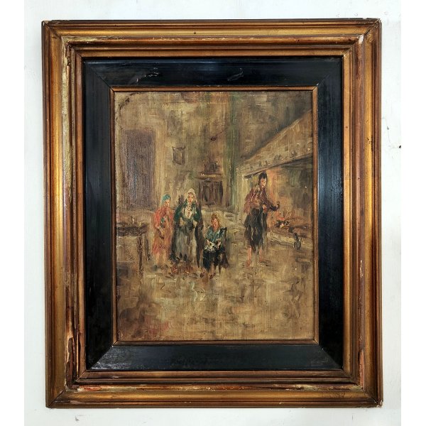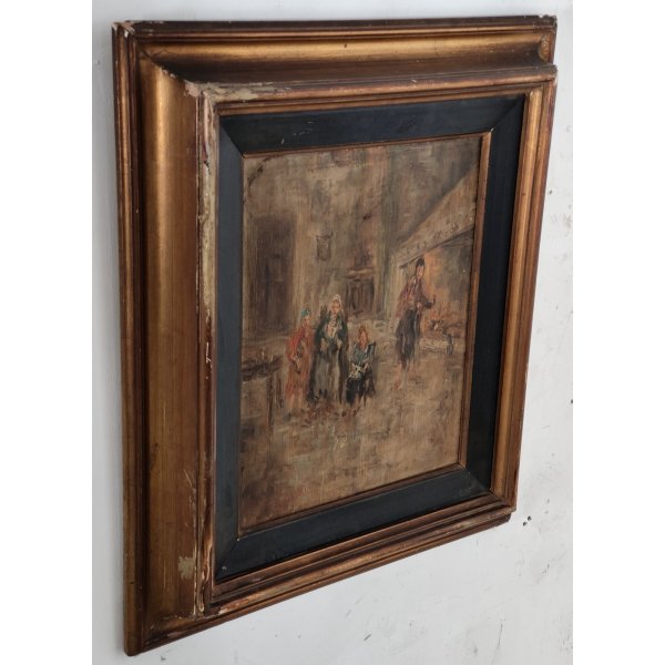 Suggestivo quadro raffigurante interno di abitazione con personaggi davanti al focolare, opera dipinta olio su tavola di serite firmata in basso a sinistra Garini e racchiusa in una cornice in legno dorato con passepartout ebanizzato