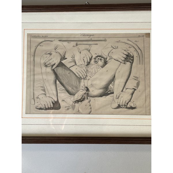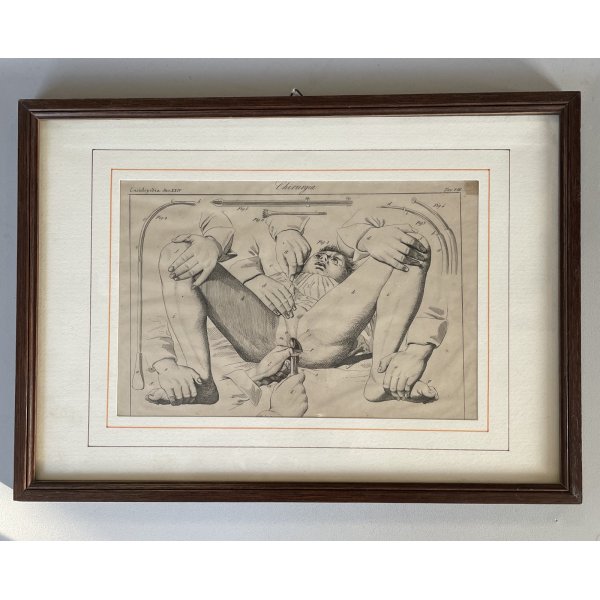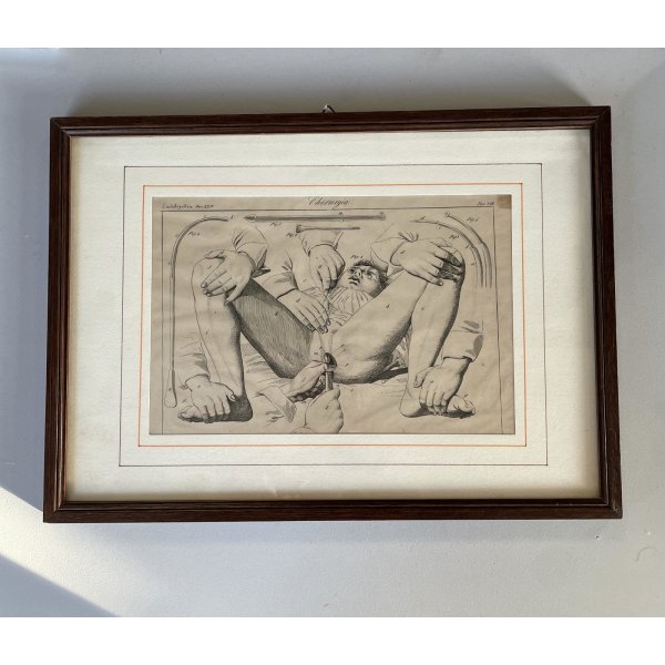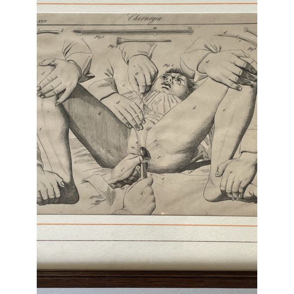 Antica stampa di una incisione storica intitolata "CHIRURGIA" che raffigura un'intervento chirurgico probabilmente un'operazione per calcoli renali o vescicali, nota come litotomia.