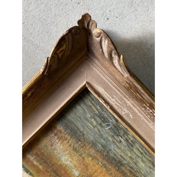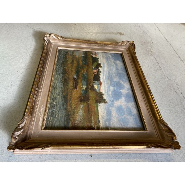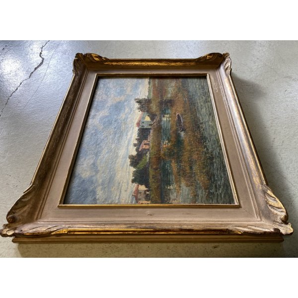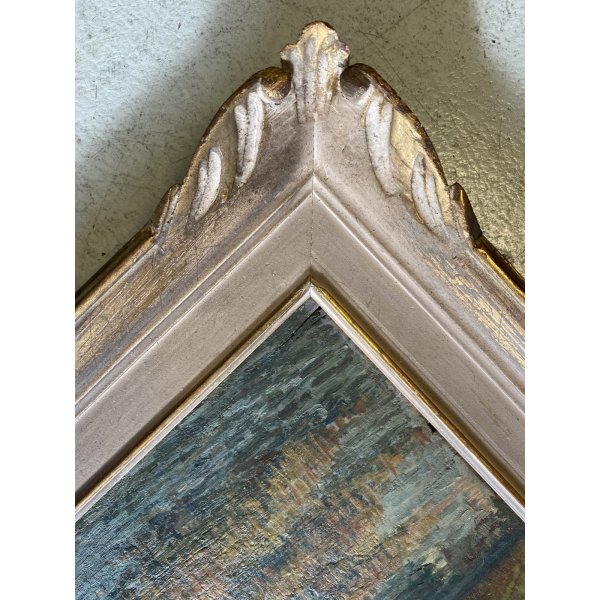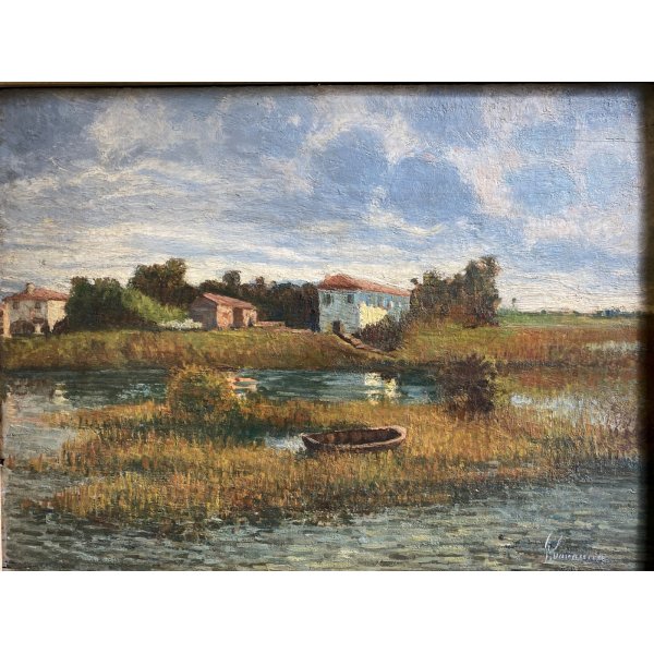Stupendo dipinto olio su tavoletta, firmato in basso a destra G. Cavanna (Tortona 1894 - 1963), rappresentante un paesaggio rurale lacustre in pianura, un antico borgo con casali che si riflettono su uno specchio d'acqua con una barchetta in primo piano. Dipinto caratterizzato dalle tonalità dell'azzurro e delle terre luminose, il colore è steso con pennellate compatte dalla resa materica, soprattutto nelle zone del cielo e della vegetazione, dove sembra vibrare alla luce naturale. Opera dalla composizione equilibrata ma spontanea con una forte carica espressiva, contenuta in una cornice lignea coeva, ornata gessata e lumeggiata oro, con segni del tempo e di utilizzo, visibili dalle fotografie allegate all'inserzione.