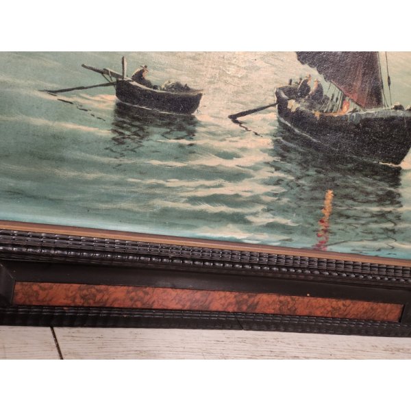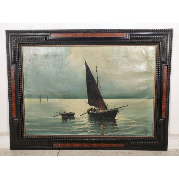 Incantevole dipinto d'epoca, raffigurante paesaggio notturno con la luna che cerca di fare capolino dalle nubi e crea riflessi argentei sulle onde del mare, in primo piano una barca a vela di pescatori naviga con lampara accesa. Opera di ottima fattura firmata in basso a destra