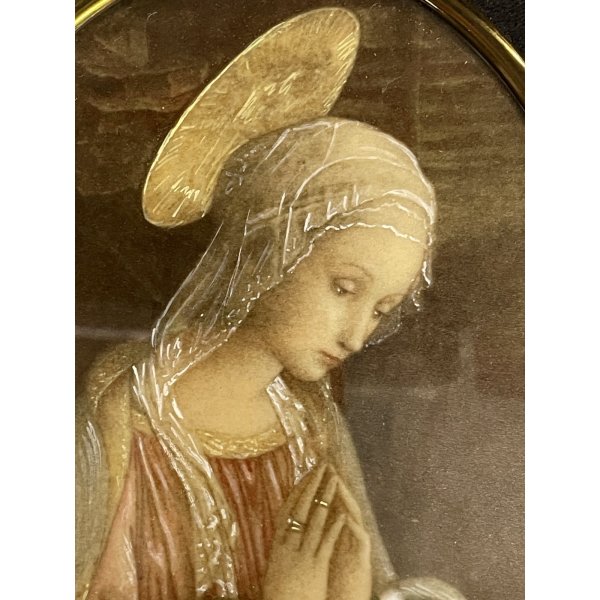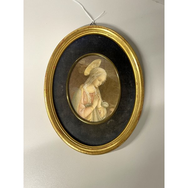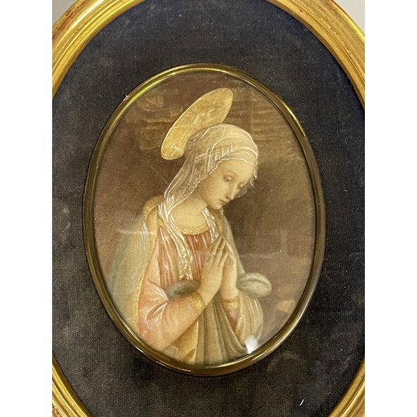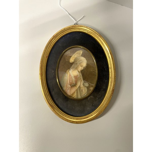 Stupenda miniatura stampata con ritocchi di luce a mano, rappresentante la Madonna in adorazione del bambino. Contenuta in una bellissima cornice ovale dorata in legno con passpartout in velluto color testa do moro.