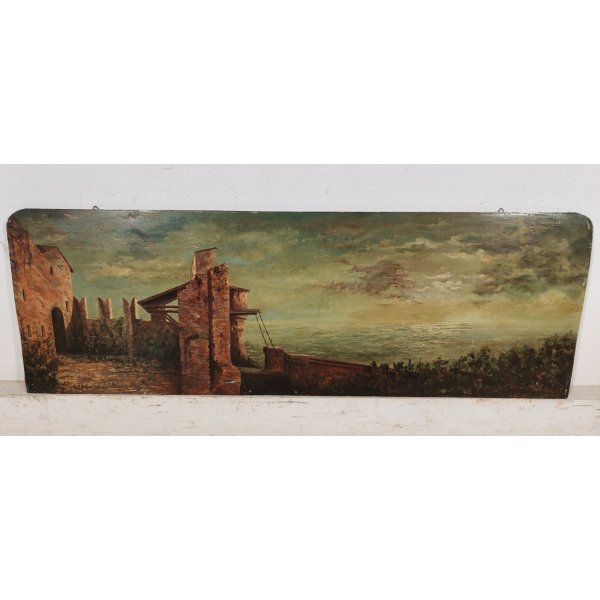 Incantevole quadro panoramico raffigurante veduta di un'alba sul mare ripresa dalle mura di un castello medievale con ponte levatoio, opera di ottima fattura e cromia, firmata in basso a destra in rosso e datata al retro