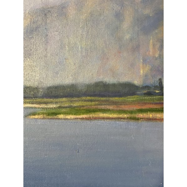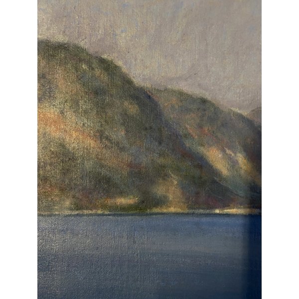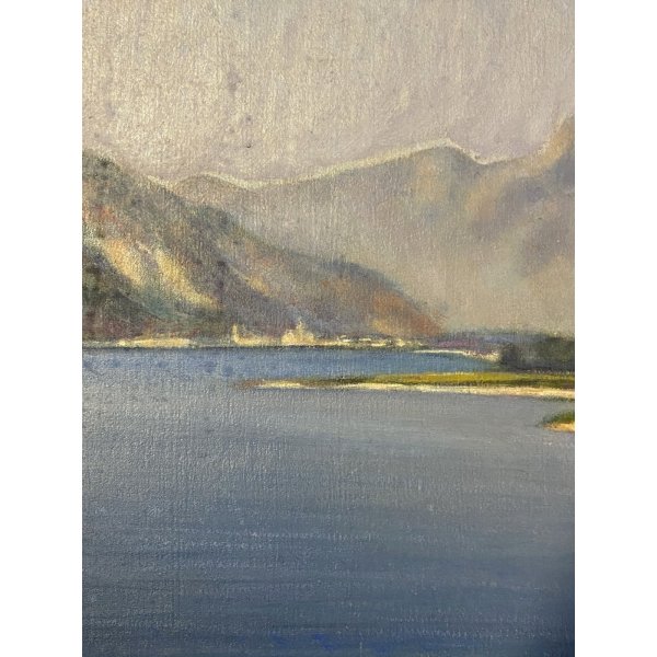 Incantevole dipinto olio su tela, rappresentante un paesaggio lacustre circondato da montagne e colline, caratterizzato da tonalità che spaziano dall' azzurro grigio del cielo, ai bruni bruciati e verdi brillanti della fascia di terreno colpita dai raggi radenti di sole, in primo piano. Un’atmosfera suggestiva che trasmette la sensazione di un’ imminente cambiamento del tempo. La scena si apre sulle acque calme del lago, in lontananza le imponenti montagne, sullo sfondo, si distingue la silouette di un piccolo borgo, forse Feriolo sul Lago Maggiore. Opera di notevole tecnica e composizione, firmata in basso a sinistra ma di difficile interpretazione, contenuta in una cornice dorata con passepartout ligneo. Il dipinto presenta piccole mancanze di film pittorico sul lato destro inferiore. Tutto visibile dalle fotografie allegate.