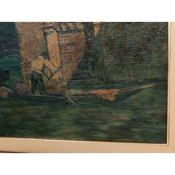 Suggestivo quadro raffigurante scorcio di canale nella laguna di Venezia, paesaggio notturno dove una falce di luna illumina un gondoliere / pescatore probabilmente intento nella pesca o nel trasporto di cesti di vimini, opera firmata in basso a destra e racchiusa in una cornice dorata con passepartout tipo velluto beige