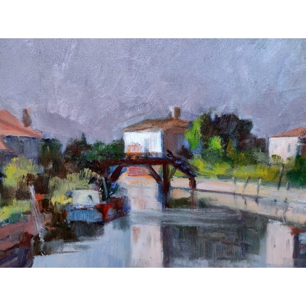 Suggestivo quadro raffigurante scorcio di canale a Mazzorbo nella laguna di Venezia, paesaggio suggestivo sulle tonalità del verde ed azzurro dove spiccano il bianco delle case con i loro tetti rossi, opera firmata in basso a sinistra