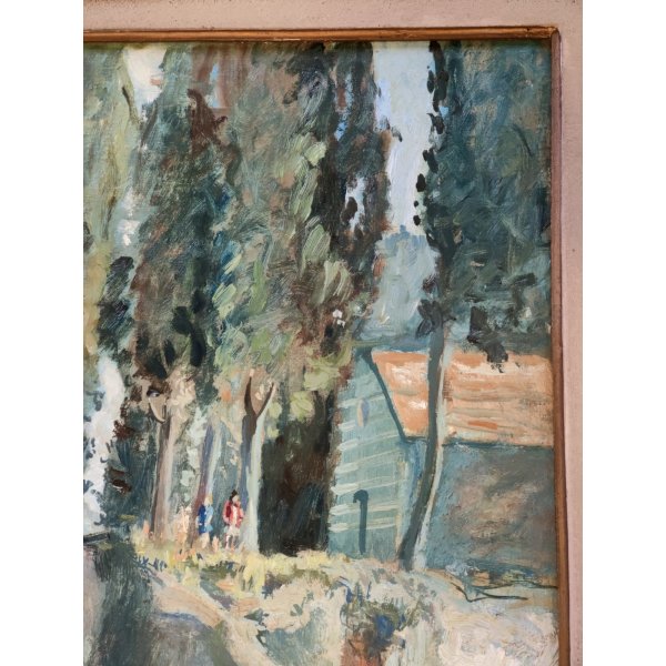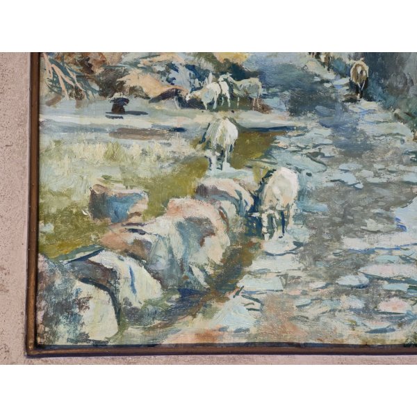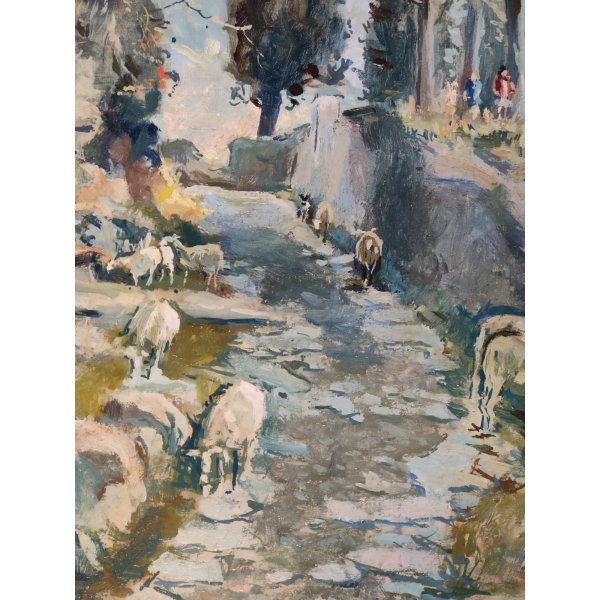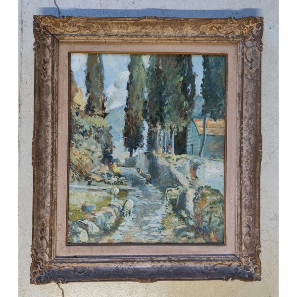 Suggestivo quadro raffigurante paesaggio montano con una strada lastricata che attraversa un bosco di conifere, poco sopra sulla destra 2 personaggi a fianco di una baita che probabilmente curano il gregge di pecore sottostante, dipinto di ottima fattura e tecnica pittorica, opera firmata in basso a destra