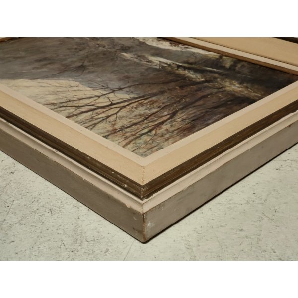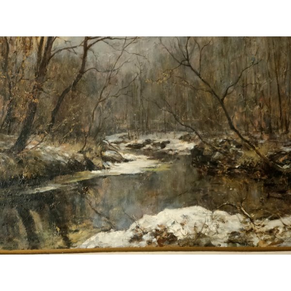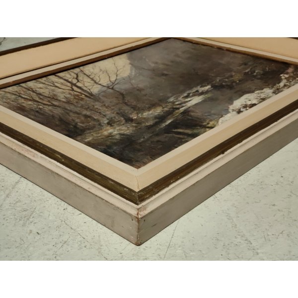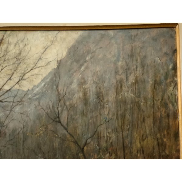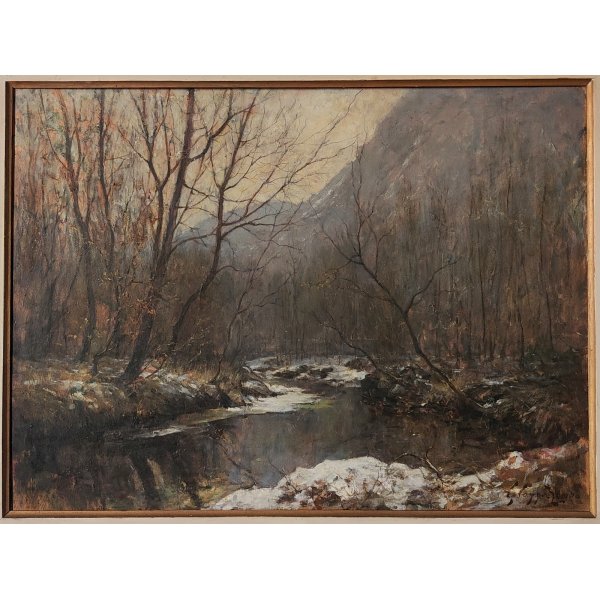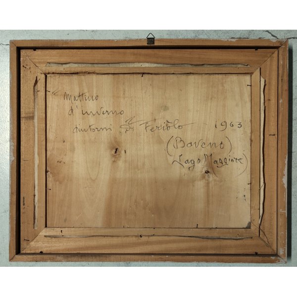Mattino d'inverno, dintorni di Feriolo" Baveno, noto per i suoi dipinti paesaggistici, la sua tecnica pittorica è caratterizzata da uno stile realistico, le luci e le ombre sono particolarmente ben studiate per dare profondità e spazialità prospettica. L'opera è contenuta in una cornice lignea color tortora con passepartout in tela grezza con normali segni del tempo