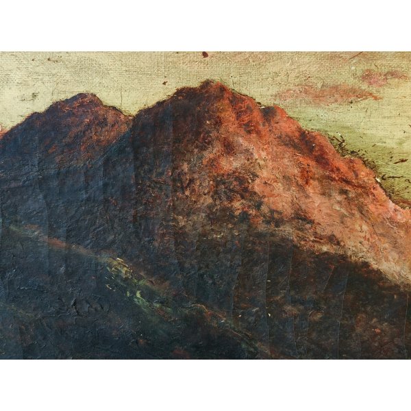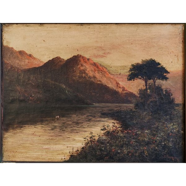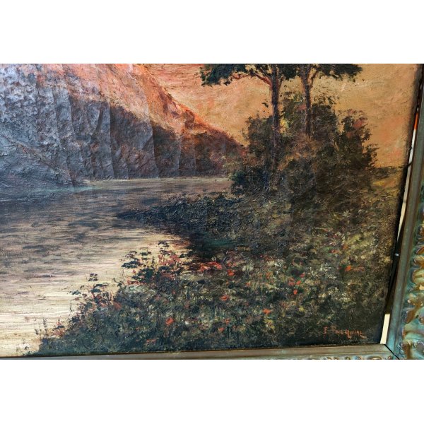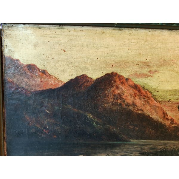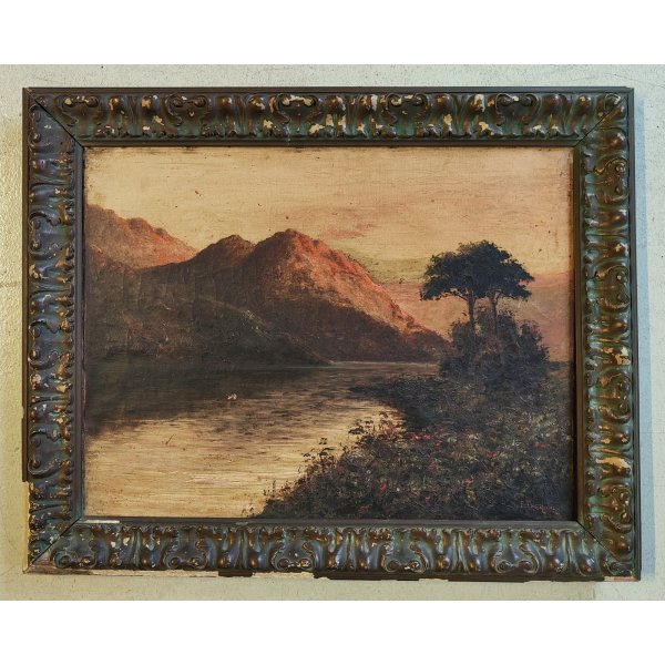 Splendido quadro dipinto ad olio su tela, raffigurante suggestivo paesaggio lacustre o di mare nel momento del tramonto. firmato in basso a destra, firma di difficile interpretazione di cui purtroppo non sono riuscito a risalire all'autore