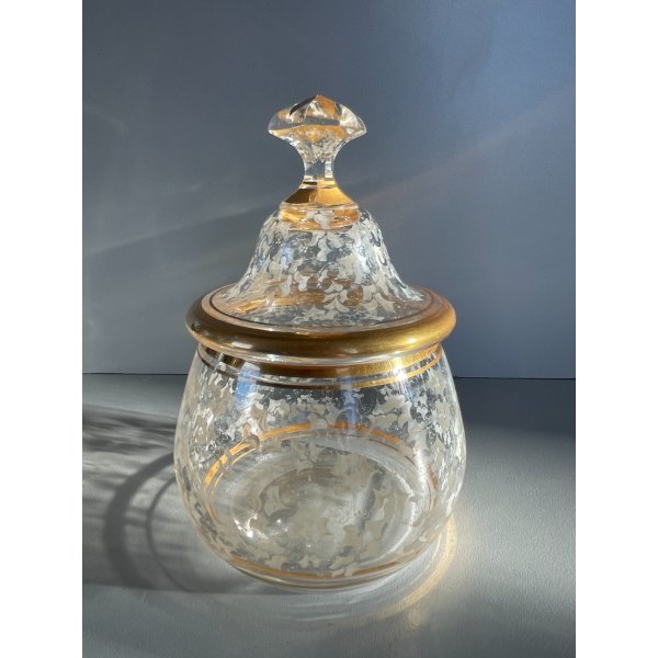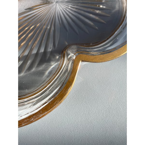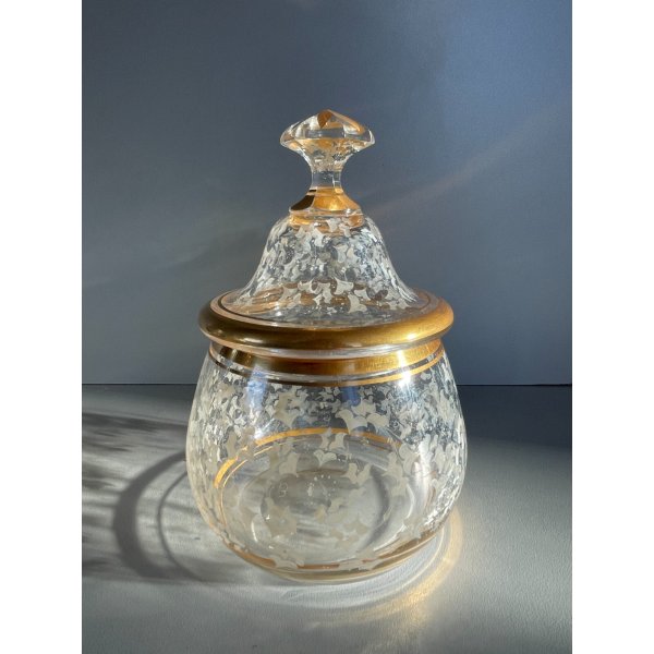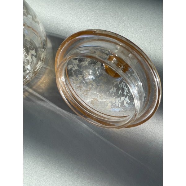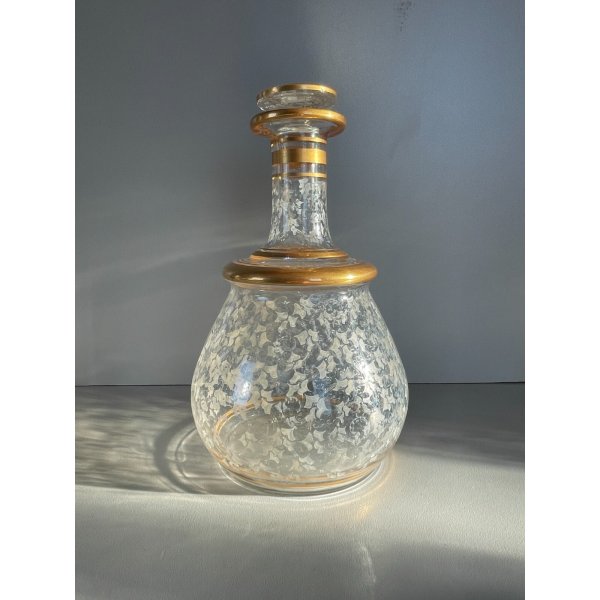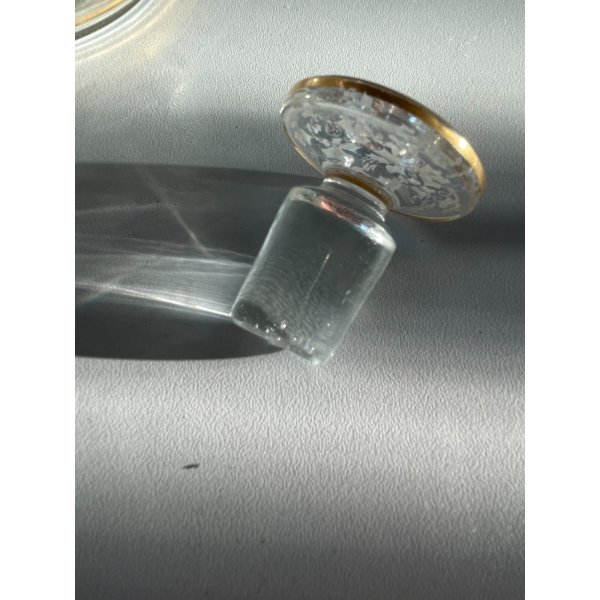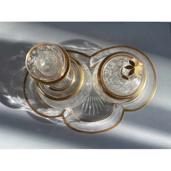 Stupendo, elegante, set da toilette vintage della prima metà del '900. Composto da tre pezzi in vetro trasparente con decoro fogliato in bianco e bordatura in oro zecchino: Un vassoio in vetro sagomato, trilobato, con decoro molato in forma di stella sulla base, un vaso con coperchio e una bottiglia con tappo. Leggeri segni del tempo in linea con l'epoca, condizioni visibili dalle fotografie allegate.