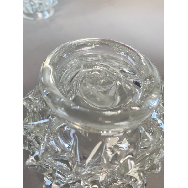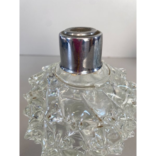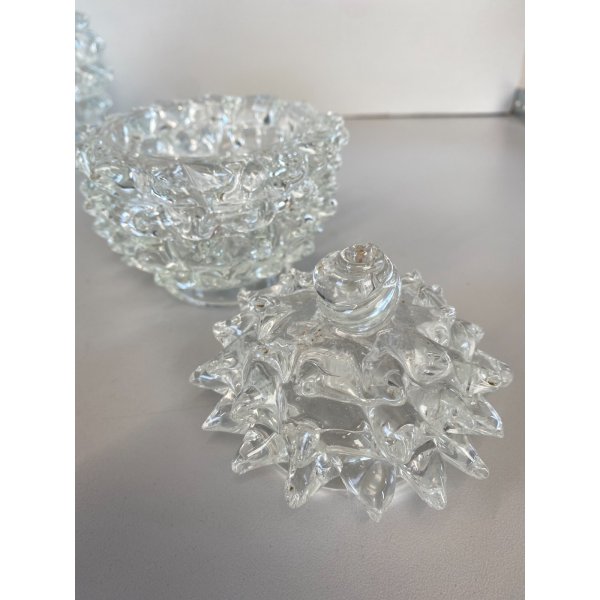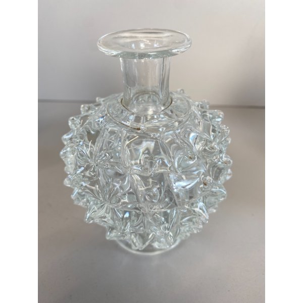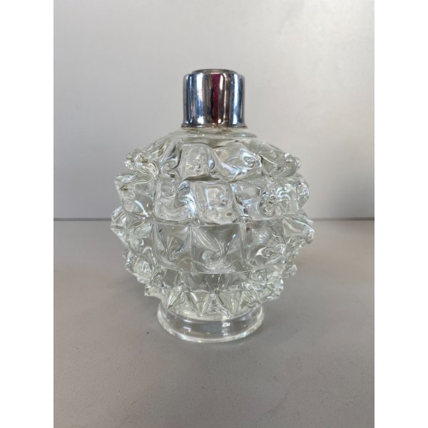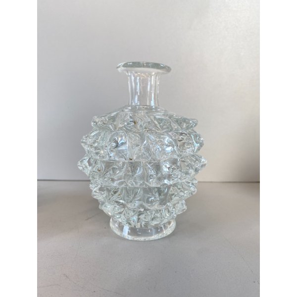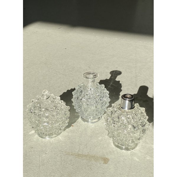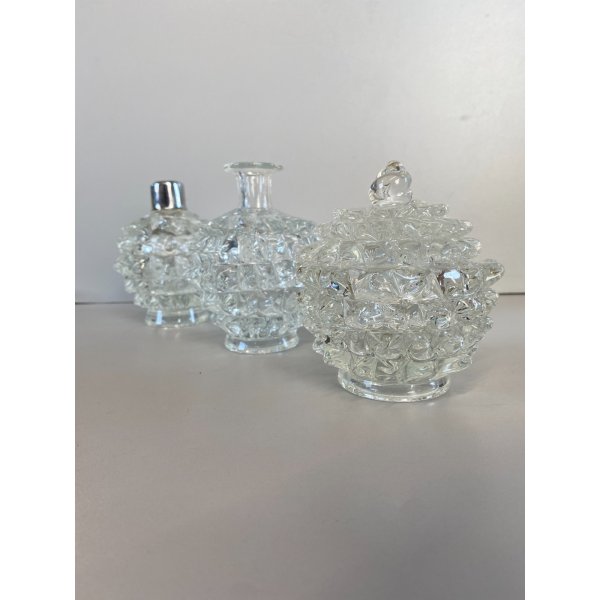 Meraviglioso "Vanity Bottles set" composto da 3 bottiglie da toilette in vetro di Murano. Il set comprende un vasetto con tappo, una bottiglia per profumo mancante della pompetta, e una vaso monofiore. Complementi d'arredo Art Decò, realizzati in vetro trasparente rostrato, con forma tonda, ogni pezzo si distingue per la raffinata lavorazione che crea un effetto a righe o a punte, tipico di questa tecnica, conferendo ai contenitori un aspetto dinamico e luminoso. Per design, fattura ed epoca il set è attribuibile ad Ercole Barovier prodotto tra gli anni '30/'40/'50
