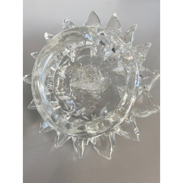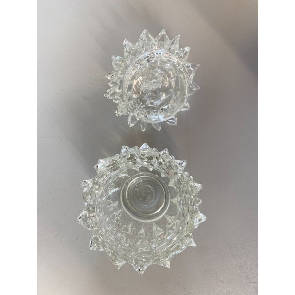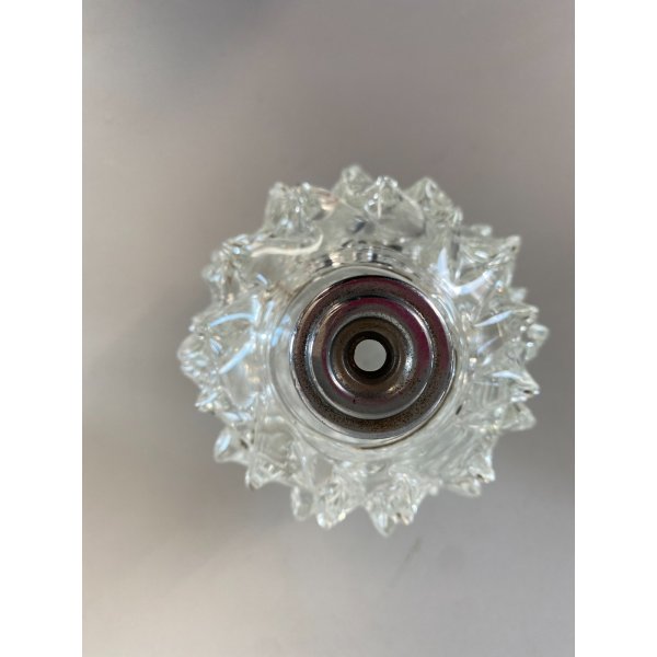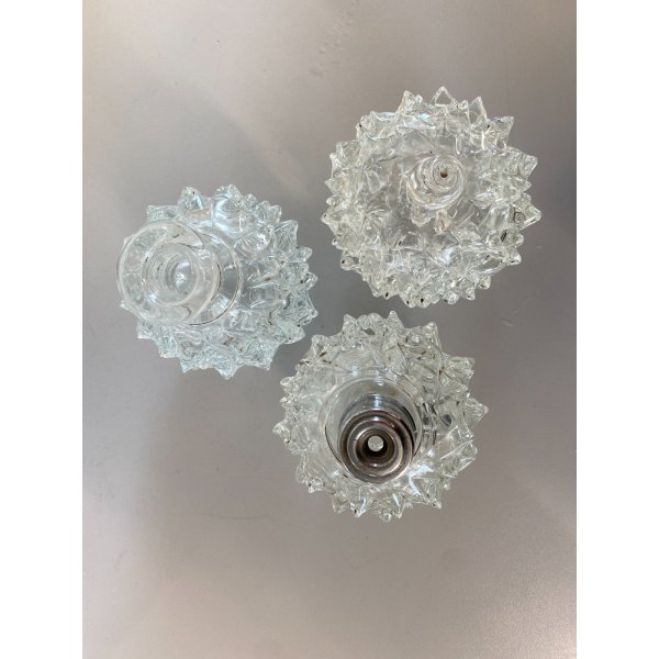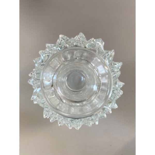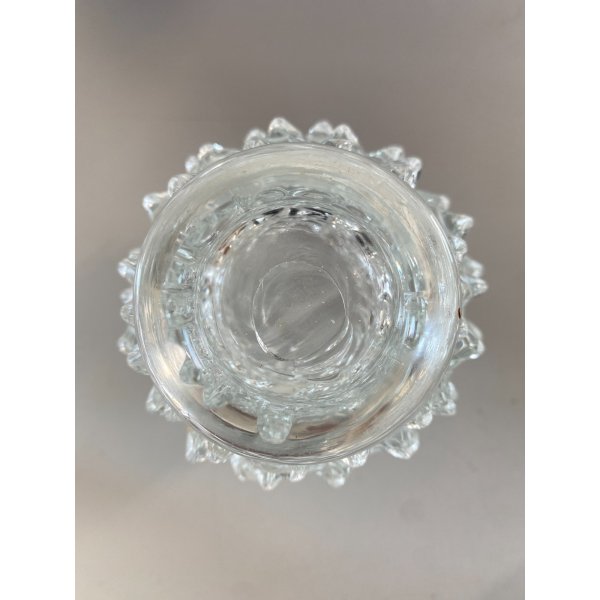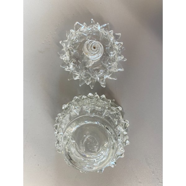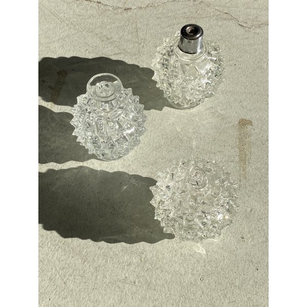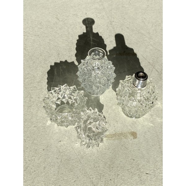 Meraviglioso "Vanity Bottles set" composto da 3 bottiglie da toilette in vetro di Murano. Il set comprende un vasetto con tappo, una bottiglia per profumo mancante della pompetta, e una vaso monofiore. Complementi d'arredo Art Decò, realizzati in vetro trasparente rostrato, con forma tonda, ogni pezzo si distingue per la raffinata lavorazione che crea un effetto a righe o a punte, tipico di questa tecnica, conferendo ai contenitori un aspetto dinamico e luminoso. Per design, fattura ed epoca il set è attribuibile ad Ercole Barovier prodotto tra gli anni '30/'40/'50