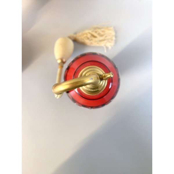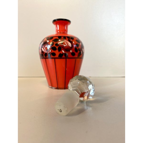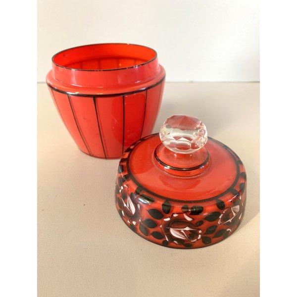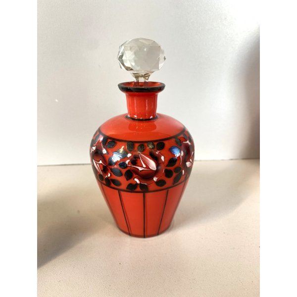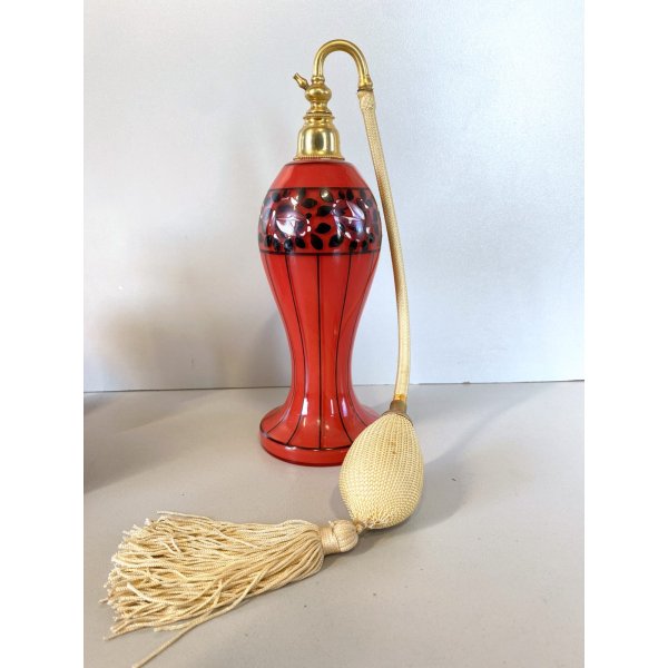 Meraviglioso "Vanity Bottles set" composto da 3 elementi da toilette in vetro di Murano. Il set comprende un vasetto con tappo e presa sferica sfaccettata, una bottiglia per profumo con pompetta, vaporizzatore dorato terminante con una nappa color champagne, e una bottiglia con tappo sferico sfaccettato. Complementi d'arredo Art Decò, realizzati in vetro rosso, con decoro nero a righe e fascia superiore decorata con motivo floreale stilizzato nero lumeggiato in bianco. Per design, fattura, prodotto tra gli anni '30/'40. Antico presenta leggeri segni del tempo. Descritti nelle condizioni