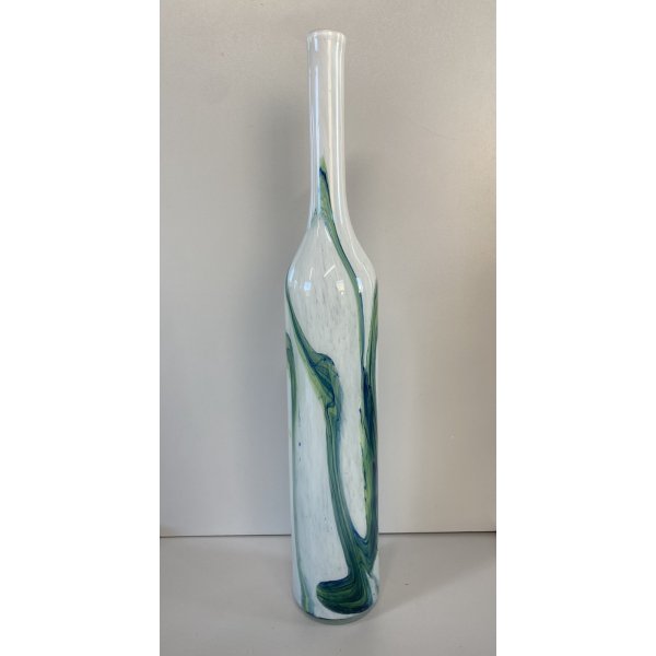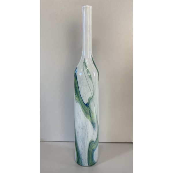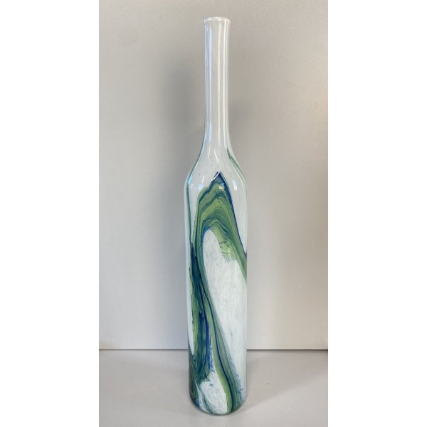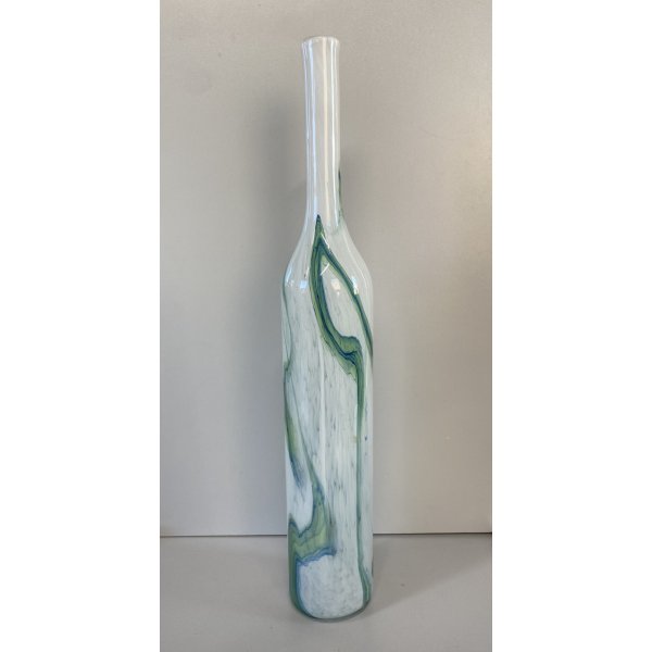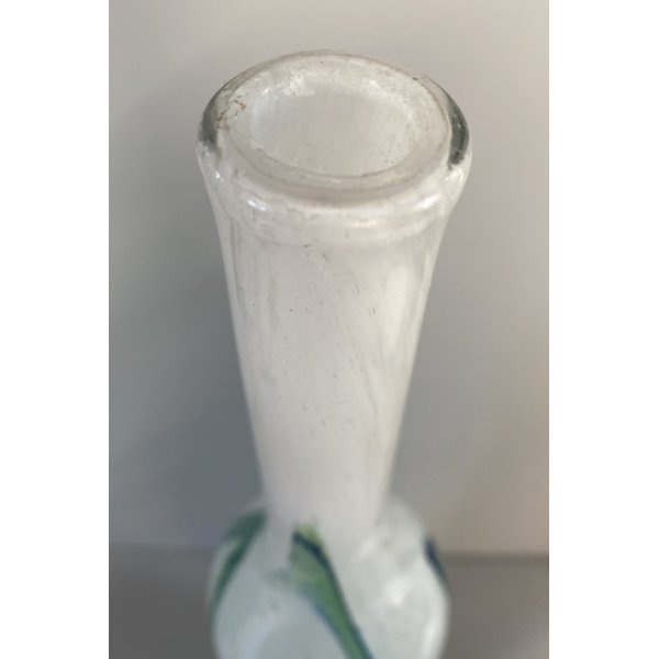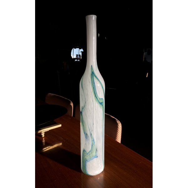 Stupendo vaso, bottiglia in vetro di Murano (ø 8 x 50 cm/h circa) caratterizzato da spirali, striature blu e verdi su sfondo bianco latte. In buone condizioni conservative. Tutto visibile dalle fotografie allegate