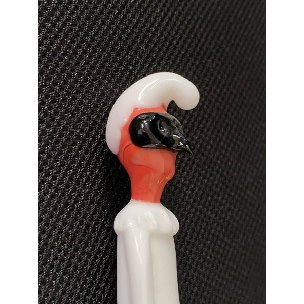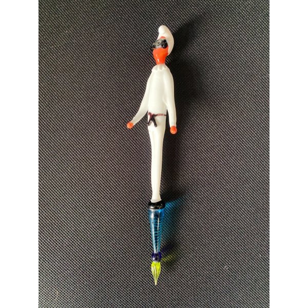 Splendida penna decorativa, ad immersione in vetro di murano che rappresenta la maschera della commedia tradizionale Napoletana di "Pulcinella". Piccola scultura prodotta nella metà del '900 di eccelsa fattura, non presenta firma. Notevole l' attenzione ai dettagli e la lavorazione raffinata. Dimensioni: 17,5 cm/h. Splendido esempio di arte decorativa in vetro di Murano
