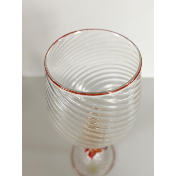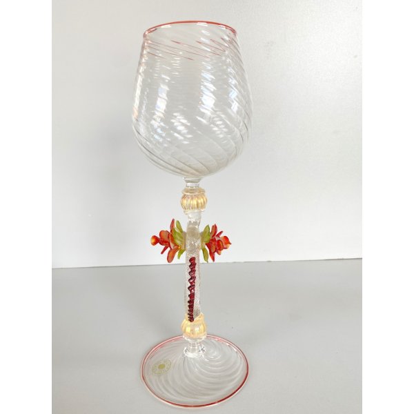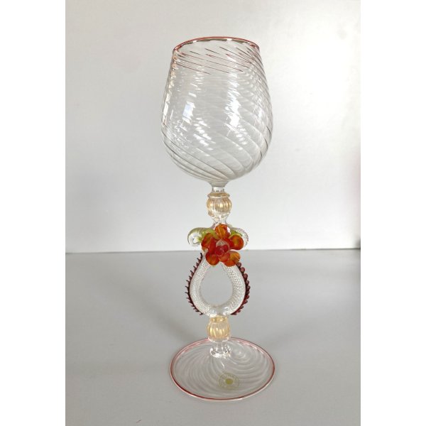 Splendido "Tipetto" in vetro soffiato di Murano. Calice dalla particolare forma del gambo, elaborata con dettagli sagomati a torciglione con applicazioni in forma di fiore color arancione su foglie verde brillante, impreziosito da sfere costolate con una leggera velatura dorata. Calice e piede sono caratterizzati da una lavorazione a spirale e bordati con una sottile linea rossa. Calice vintage della seconda metà del '900 in buono stato di conservazione, sulla base etichetta adesiva rotonda "Murano Glass"